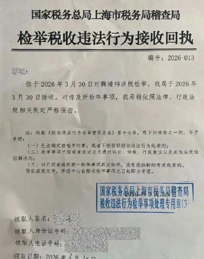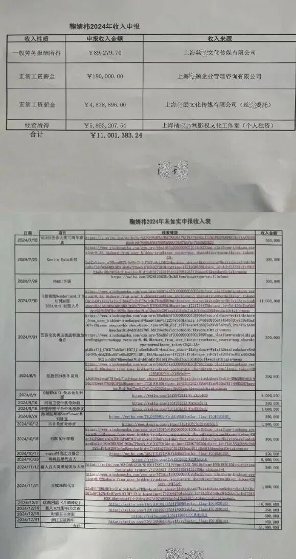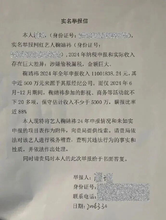 今天(3月31日),一份艺人鞠婧祎被实名举报税务问题的文件被曝光。举报人声称2024年鞠婧祎申报了1100多万,但实际收入估计有5000多万,瞒报比例将近88% 。