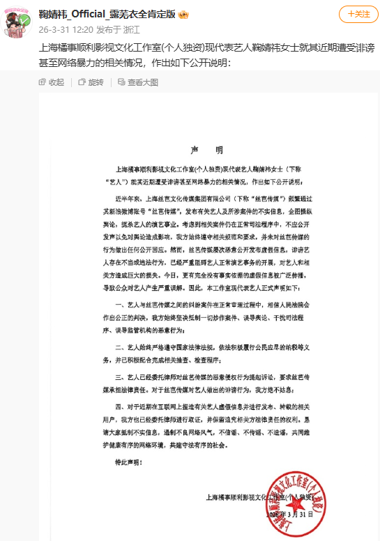 上海橘事顺利影视文化工作室(个人独资)现代表艺人鞠婧祎女士(下称“艺人”)就其近期遭受诽谤甚至网路暴力的相关情况,作出如下公开说明: