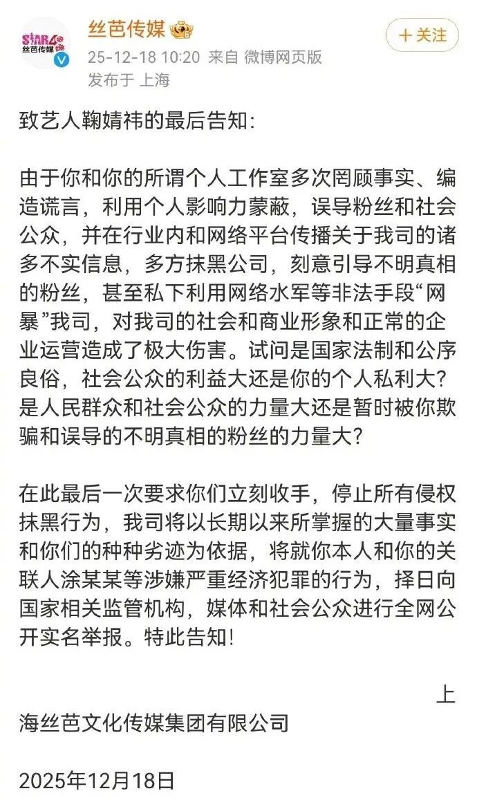该司敬告艺人,切勿把精力浪费在东拉西扯对我司的网暴上,而应重点正面回应全网公众最关注的实质性问题: